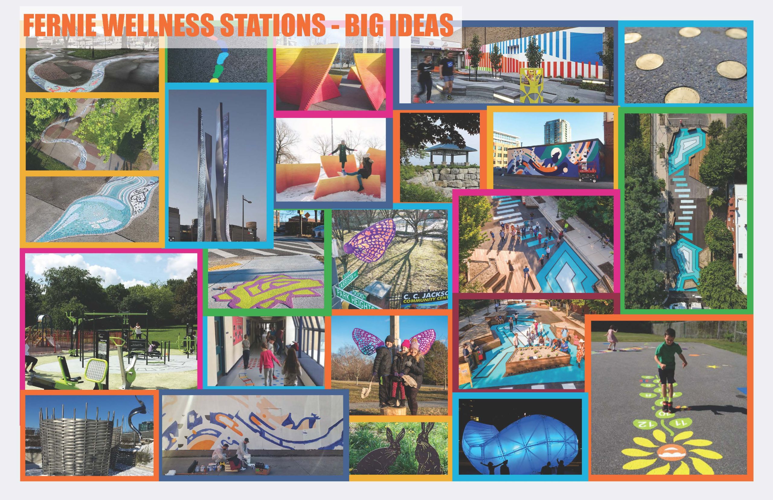 - Physical expression of theme, the fun part, determining exactly what a wellness station can look like (Considering amenities such as exercise equipment, benches, storyboards, structures, etc.)