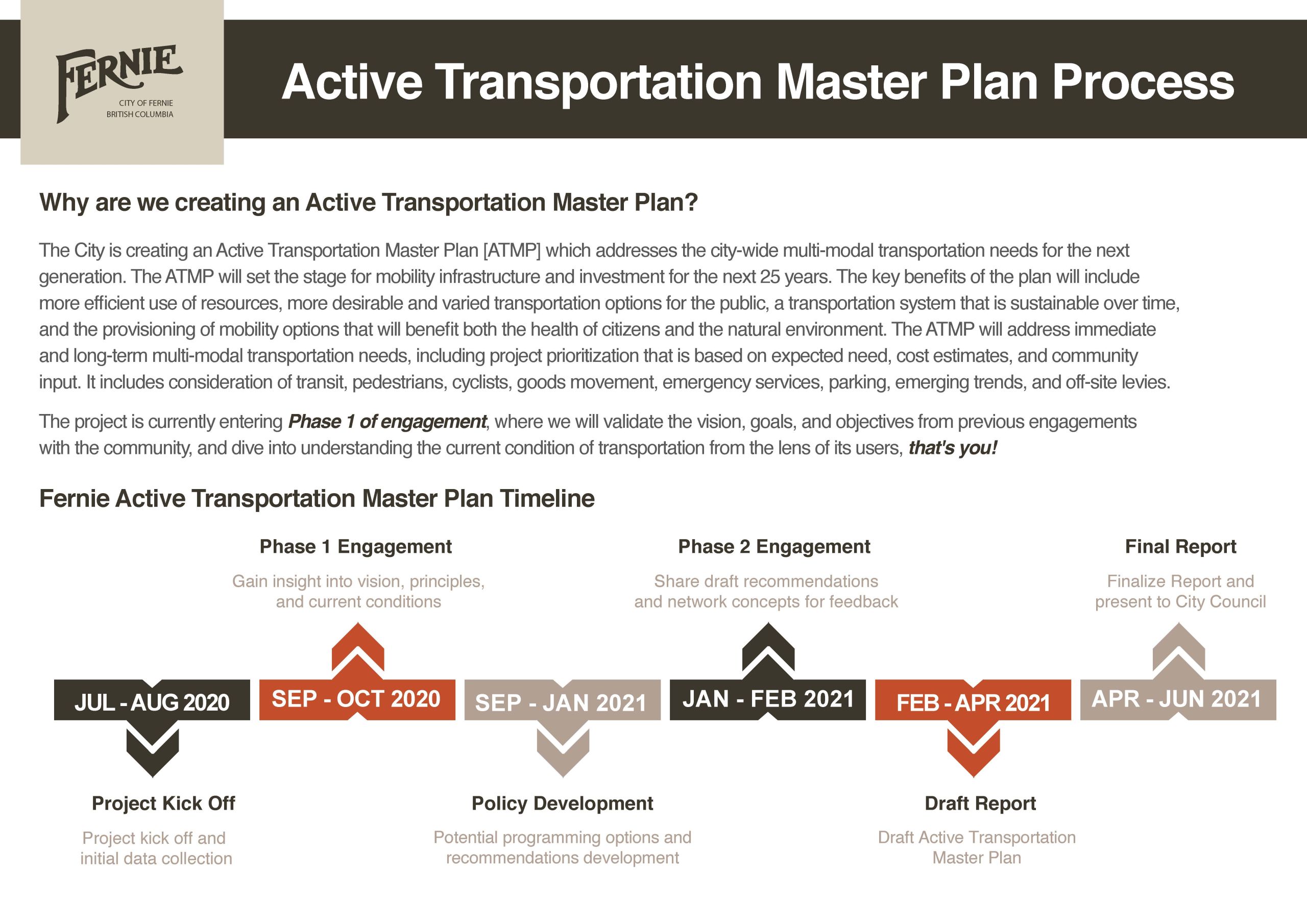 The City of Fernie has completed the Active transportation Master Plan (ATMP) that will address the city-wide multi-modal transportation needs for the next generation. Thank you for your input on this important project. The ATMP was adopted by Council on May 24, 2022.