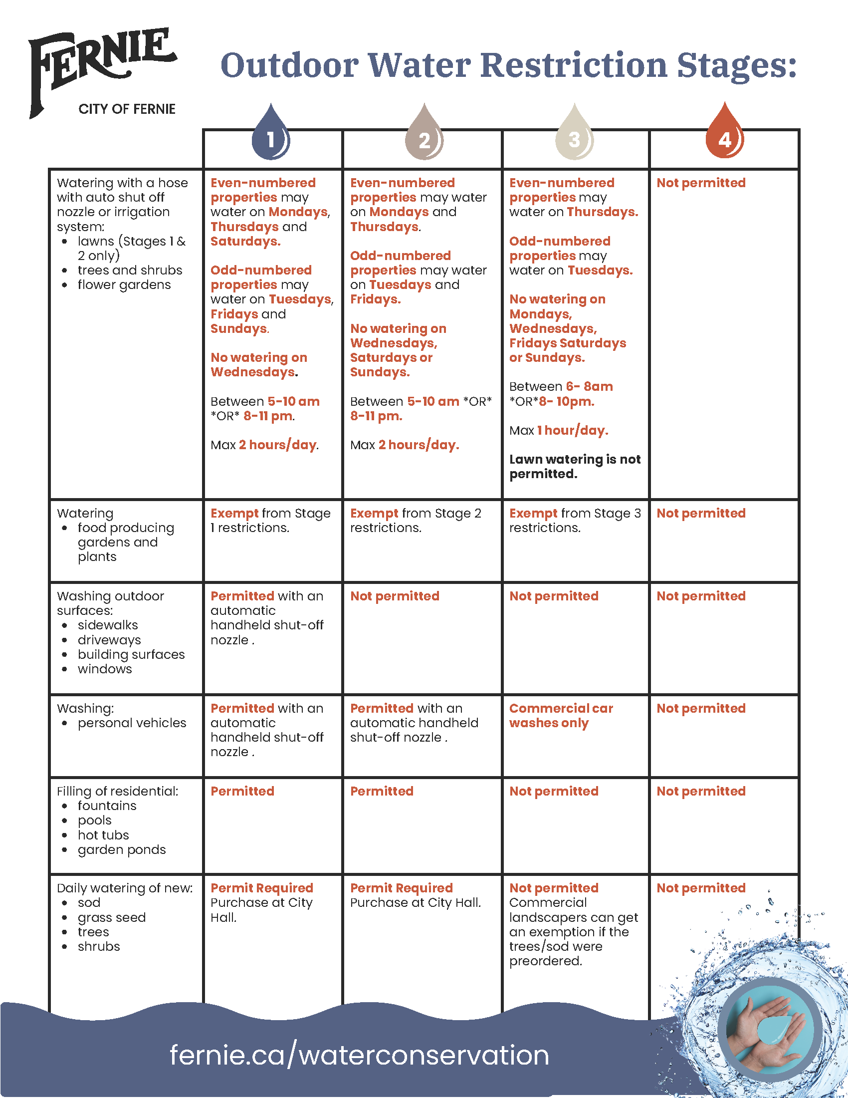 - This starts with Stage 1 (automatically in effect from March 1 - October 15 each year) and escalates depending on reservoir levels, flows in creeks that feed the source, demand exceeding capacity, and Provincial area drought declarations.